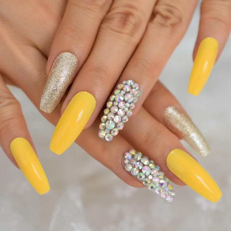 Neon Leon Yellow Press On False Nails Holo Gems Gold Glitter Extra Long Coffin Ballerina Full Fingersnails Free Adhesive Tapes From Dangdangqiu 18 83 Dhgate Com