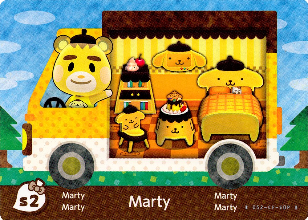 Each of the villagers in the collaboration are inspired by the characters however they all share the trait of being. That little yellow bear is named Marty and he is quite possibly the least monstrous of the Sanrio-inspired villagers sporting a shirt featuring a knit face of Sanrios Pompompurin. Animal Crossing New Horizons Sanrio Amiibo card coins all 6 ACNH 25mm 1.