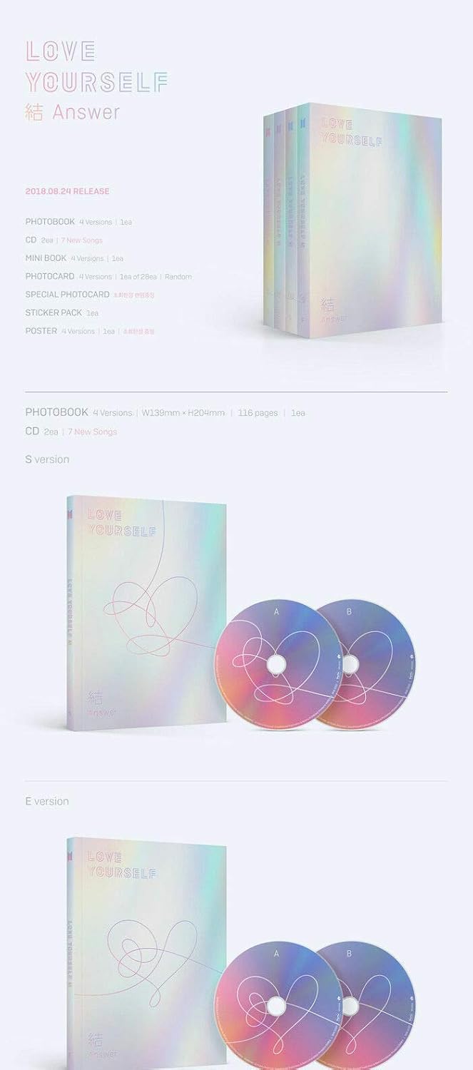 BTS - Love Yourself 結 Answer 4th Album S VER 2CD116p PhotoBook20p Mini Book1p PhotoCard1p StickerPre-Order K-POP Sealed. Pre-order benefits Special Photo Card may be sold out after few daysIf there is no Special Photo Card please note that it is already sold out. BTS - Love Yourself 結 Answer 4th Album F VER 2CDPoster116p PhotoBook20p Mini Book1p PhotoCard1p StickerPre-OrderExtra PhotoCard Set K-POP Sealed 48 out of 5 stars 205 2890.